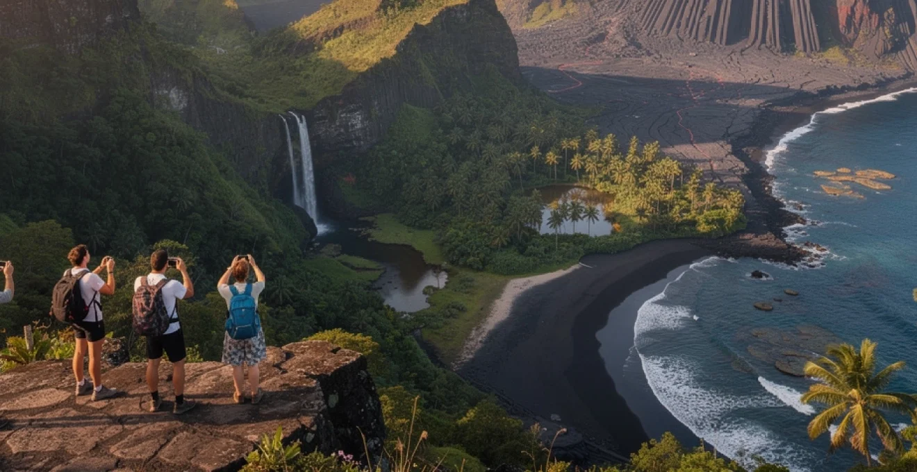 À quelques kilomètres de là, l’Anse des Cascades offre un contraste saisissant avec la rudesse du Cap Méchant. Cette petite baie abritée est entourée de falaises couvertes d’une végétation tropicale luxuriante, d’où se jettent de multiples filets d’eau douce. Les cascades, alimentées par les pluies abondantes de la région, tombent directement à proximité du rivage, créant un paysage de carte postale où se mêlent basalte, eau et palmiers.
